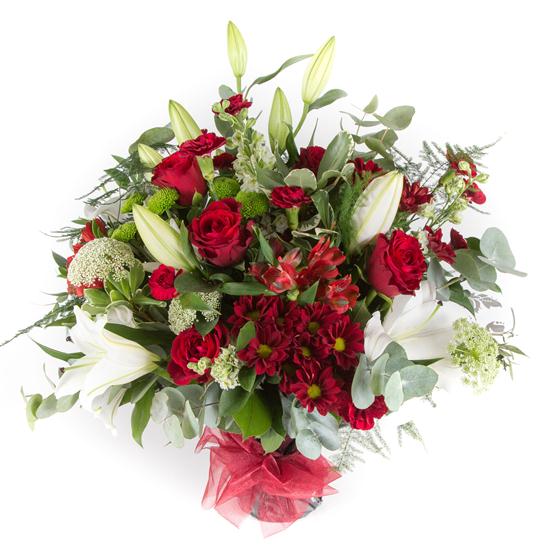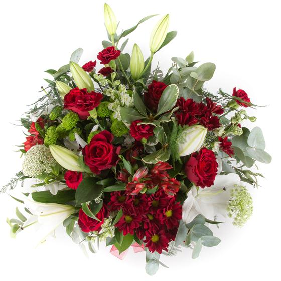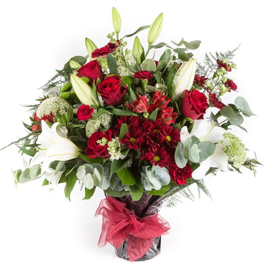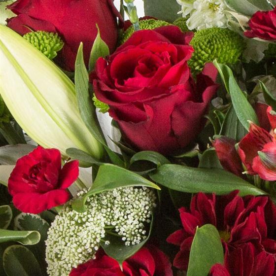 An seasonal collection including red roses, oriental lilies with a variety of red and lime blooms and foliage.